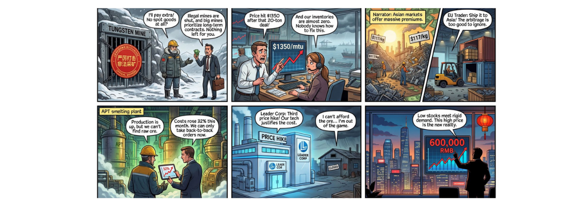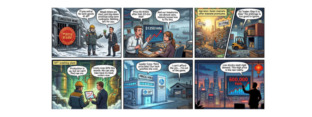 Begin 2025 kostte wolfraamconcentraat nog rond de €280 per metrische ton. Eind december stond het op ruim €600 — een stijging van meer dan 200%. Ammonium paratungstate (APT), de tussenstof die we gebruiken om wolfraam carbide te maken, steeg van rond de €335 per mtu naar boven de €1.000 per mtu.